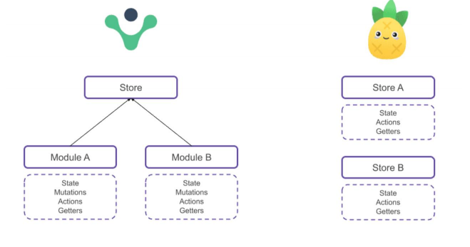 你可以灵活使用每一个 store,它们是通过扁平化的方式来相互使用的;