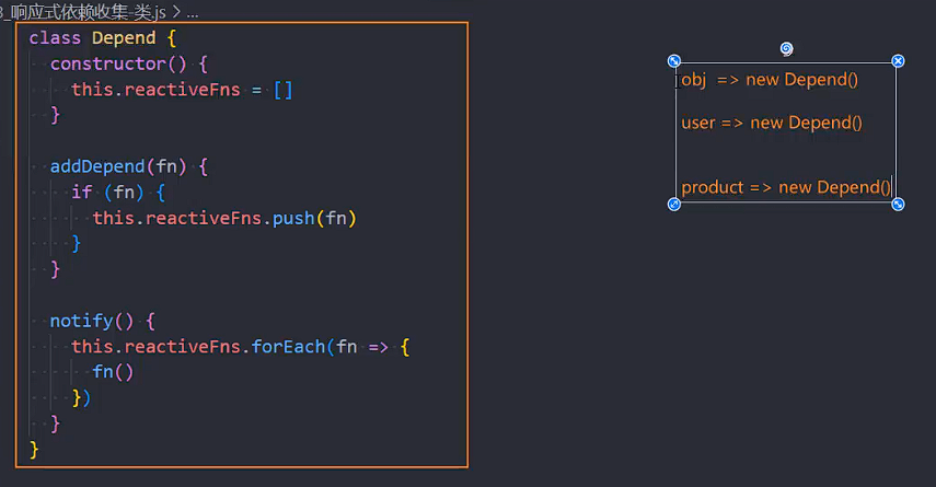 所以我们要设计一个类,这个类用于管理某一个对象的某一个属性的所有响应式函数: