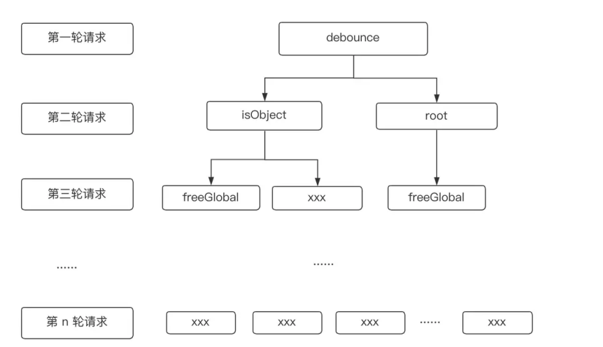 我在应用代码中调用了 debounce 方法,这个方法会依赖很多工具函数,如下图所示: