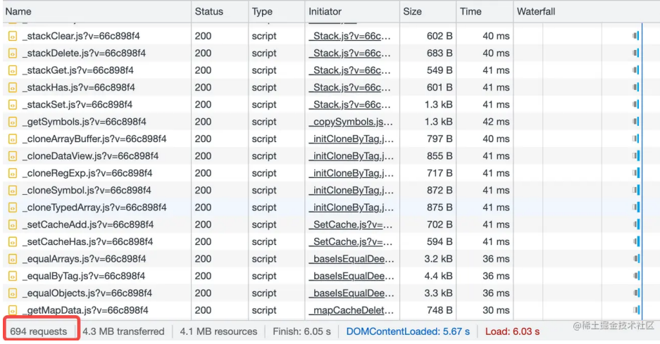 此外,还有一个比较重要的问题——请求瀑布流问题。比如说,知名的 loadsh-es 库本身是有 ES 版本产物的,可以在 Vite 中直接运行。但实际上,它在加载时会发出特别多的请求,导致页面加载的前几秒几都乎处于卡顿状态,拿一个简单的 demo 项目举例,请求情况如下图所示: