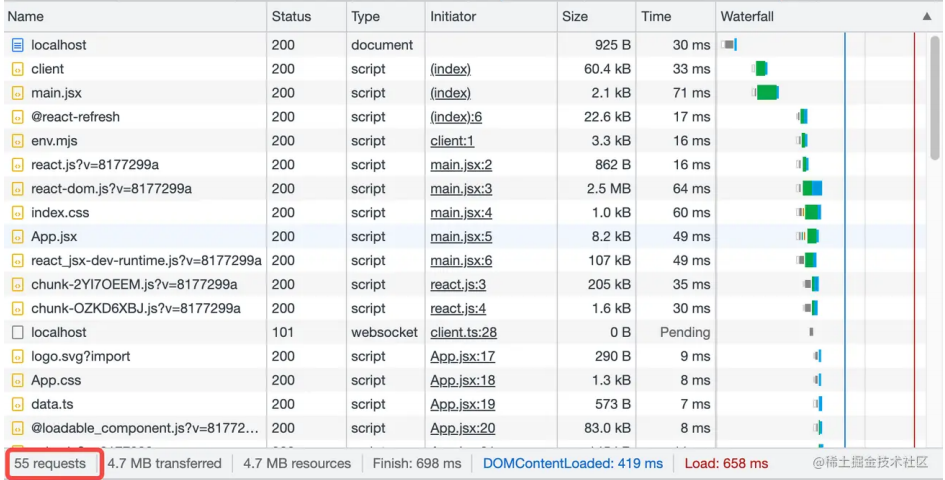每个 import 都会触发一次新的文件请求,因此在这种 依赖层级深 、 涉及模块数量多 的情况下,会触发成百上千个网络请求,巨大的请求量加上 Chrome 对同一个域名下只能同时支持 6 个 HTTP 并发请求的限制,导致页面加载十分缓慢,与 Vite 主导性能优势的初衷背道而驰。不过,在进行依赖的预构建之后, lodash-es 这个库的代码被打包成了一个文件,这样请求的数量会骤然减少,页面加载也快了许多。下图是进行预构建之后的请求情况,你可以对照看看: