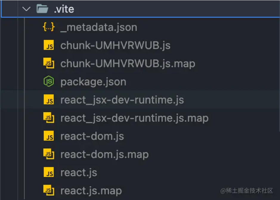 同时,在项目启动成功后,你可以在根目录下的 node_modules 中发现 .vite 目录,这就是预构建产物文件存放的目录,内容如下: