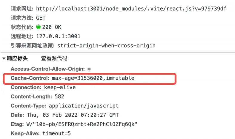 并且对于依赖的请求结果,Vite 的 Dev Server 会设置强缓存: