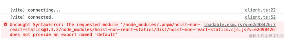 这是为什么呢? 我们刚刚手动 exclude 的包 @loadable/component 本身具有 ESM 格式的产物,但它的某个依赖 hoist-non-react-statics 的产物并没有提供 ESM 格式,导致运行时加载失败。